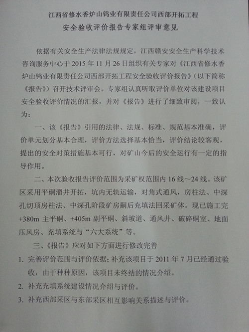江西省修水香爐山鎢業(yè)有限公司評(píng)審意見(jiàn)